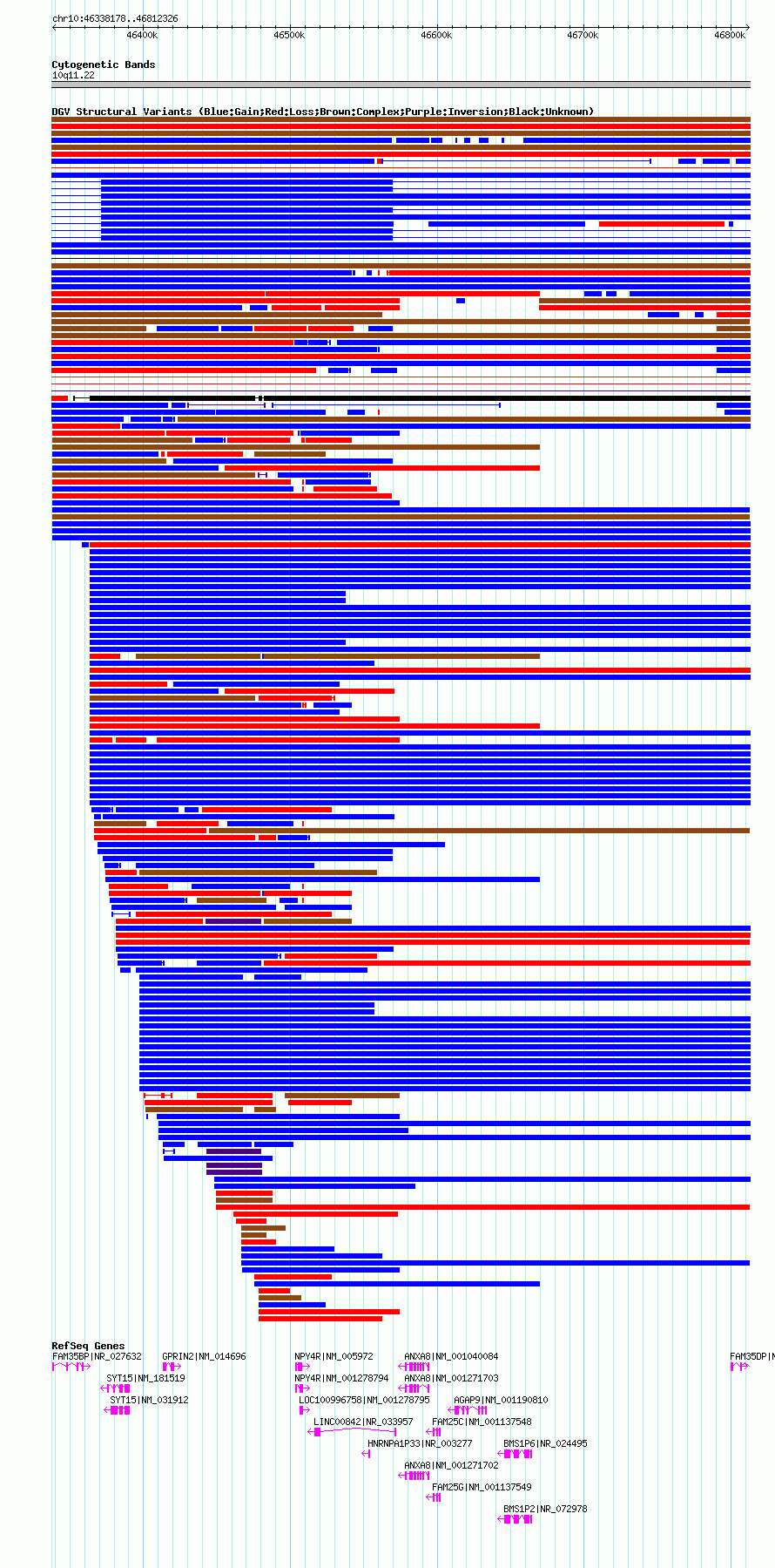 Variant DetailsVariant: dgv755n100| Internal ID | 22786842 | | Landmark | | | Location Information | | | Cytoband | 10q11.22 | | Allele length | | Assembly | Allele length | | hg19 | 474149 | | hg18 | 474149 |