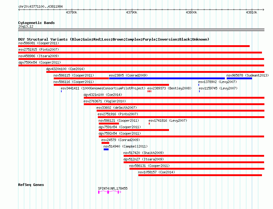 | Variant Type | CNV loss | Copy Number | | Allele State | | Allele Origin | | Probe Count | | Validation Flag | | Merged Status | M | Merged Variants | | Supporting Variants | nsv586118, nsv586120, nsv586114, nsv586117, nsv586119 | Samples | HGDP00522 | Known Genes | SPINT4 | Method | SNP array | Analysis | Illumina SNP array copy number analysis | Platform | Not reported | Comments | | Reference | Cooper_et_al_2011 | Pubmed ID | 21841781 | Accession Number(s) | dgv7590n54