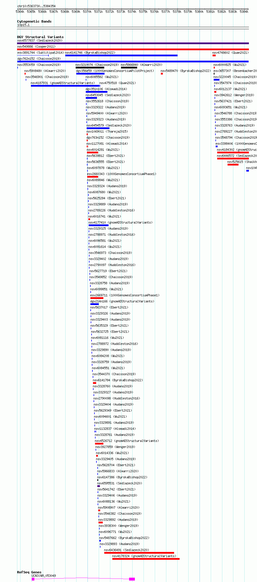 Variant DetailsVariant: dgv762n152| Internal ID | 22816465 | | Landmark | | | Location Information | | | Cytoband | 10p15.1 | | Allele length | | Assembly | Allele length | | hg38 | 20625 | | hg19 | 20625 |