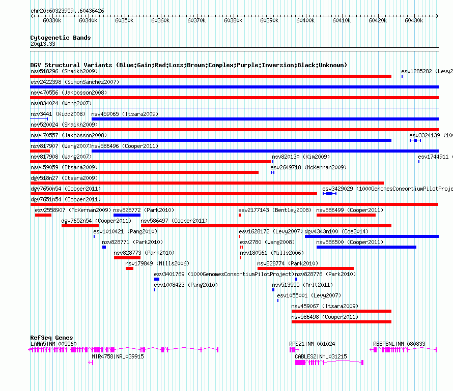 Variant DetailsVariant: dgv7651n54| Internal ID | 22775546 | | Landmark | | | Location Information | | | Cytoband | 20q13.33 | | Allele length | | Assembly | Allele length | | hg38 | 112468 | | hg19 | 112468 | | hg18 | 112468 |