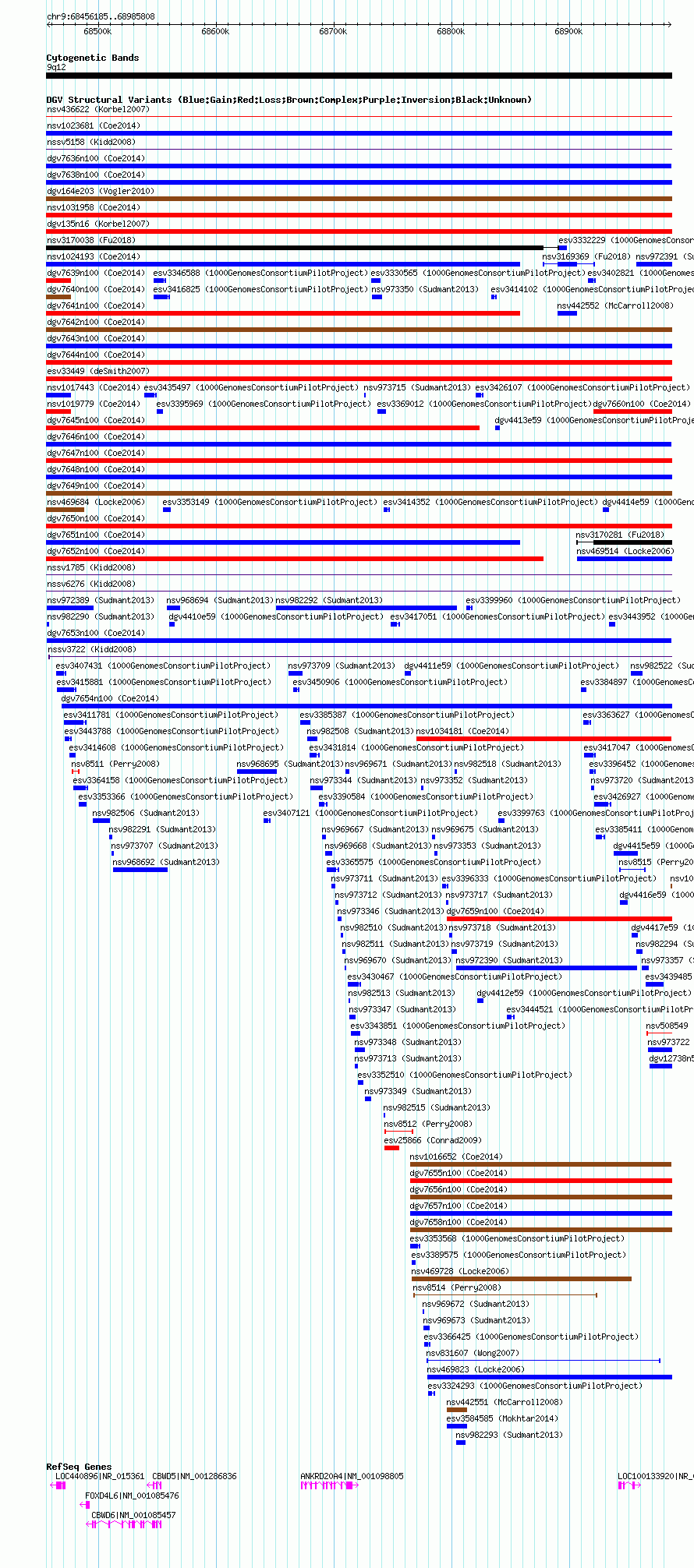 Variant DetailsVariant: dgv7653n100| Internal ID | 22793740 | | Landmark | | | Location Information | | | Cytoband | 9q12 | | Allele length | | Assembly | Allele length | | hg38 | 715123 | | hg19 | 529624 | | hg18 | 529624 |
