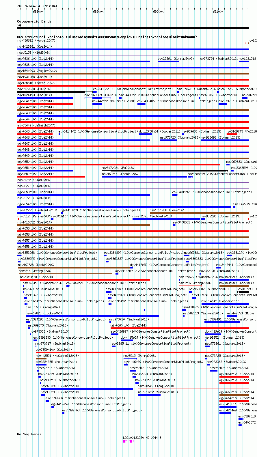 Variant DetailsVariant: dgv7655n100| Internal ID | 22793742 | | Landmark | | | Location Information | | | Cytoband | 9q12 | | Allele length | | Assembly | Allele length | | hg38 | 385108 | | hg19 | 385108 | | hg18 | 385108 |