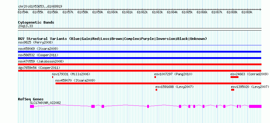 | | Variant Type | CNV loss | | Copy Number | | | Allele State | | | Allele Origin | | | Probe Count | | | Validation Flag | | | Merged Status | M | | Merged Variants | | | Supporting Variants | nsv586533, nsv586534 | | Samples | 1780862021_A | | Known Genes | SLC17A9 | | Method | SNP array | | Analysis | Illumina SNP array copy number analysis | | Platform | Not reported | | Comments | | | Reference | Cooper_et_al_2011 | | Pubmed ID | 21841781 | | Accession Number(s) | dgv7659n54