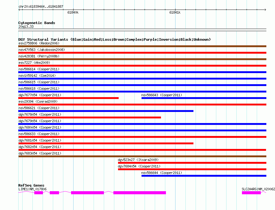 Variant DetailsVariant: dgv7682n54| Internal ID | 22775577 | | Landmark | | | Location Information | | | Cytoband | 20q13.33 | | Allele length | | Assembly | Allele length | | hg38 | 2424 | | hg19 | 2424 | | hg18 | 2424 |