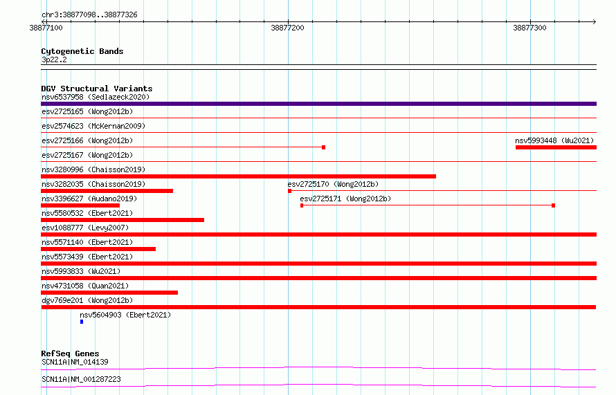 Variant DetailsVariant: dgv769e201| Internal ID | 22760127 | | Landmark | | | Location Information | | | Cytoband | 3p22.2 | | Allele length | | Assembly | Allele length | | hg38 | 229 | | hg19 | 229 |