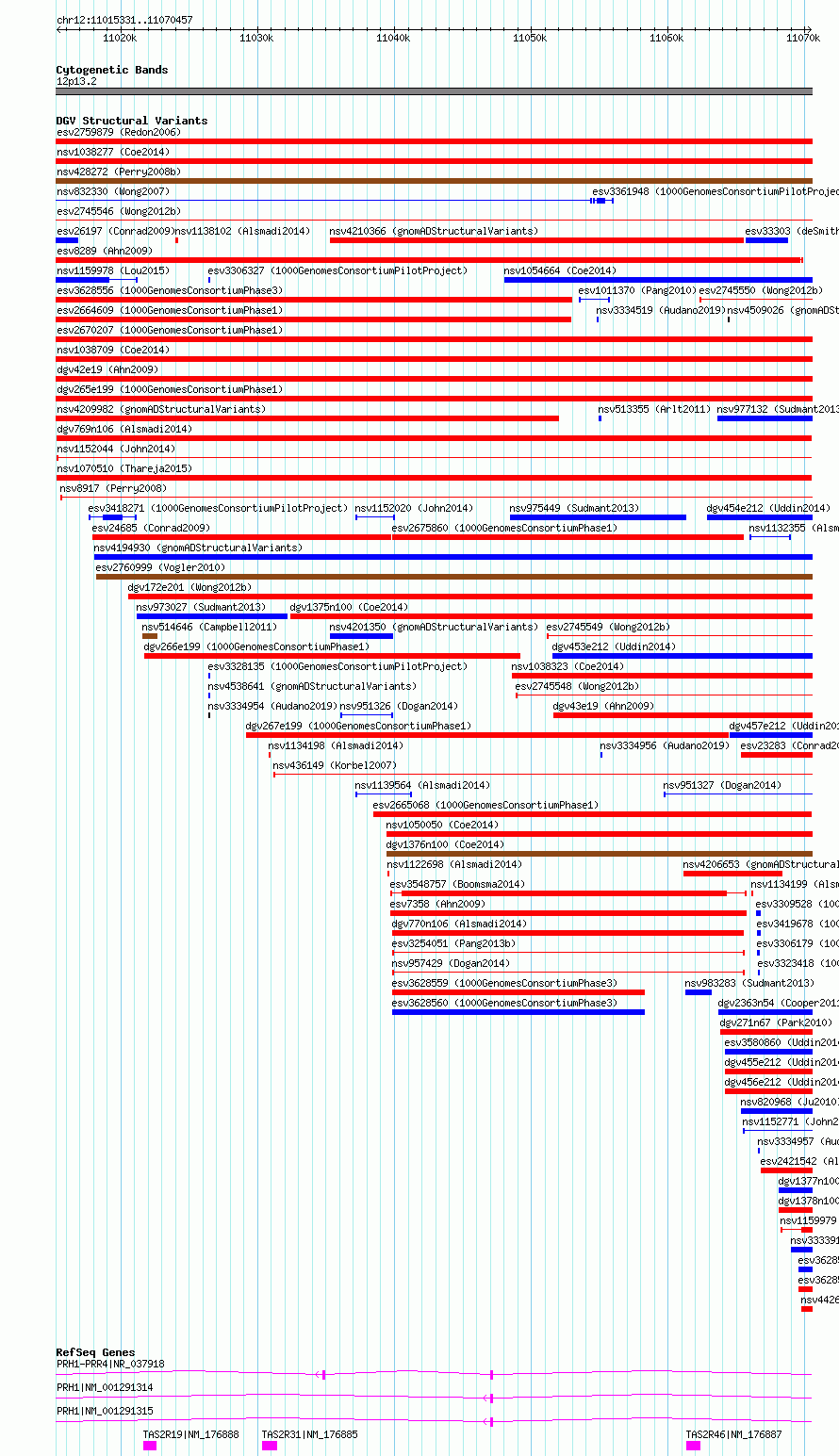 Variant DetailsVariant: dgv769n106| Internal ID | 20160126 | | Landmark | | | Location Information | | | Cytoband | 12p13.2 | | Allele length | | Assembly | Allele length | | hg38 | 55127 | | hg19 | 55127 |