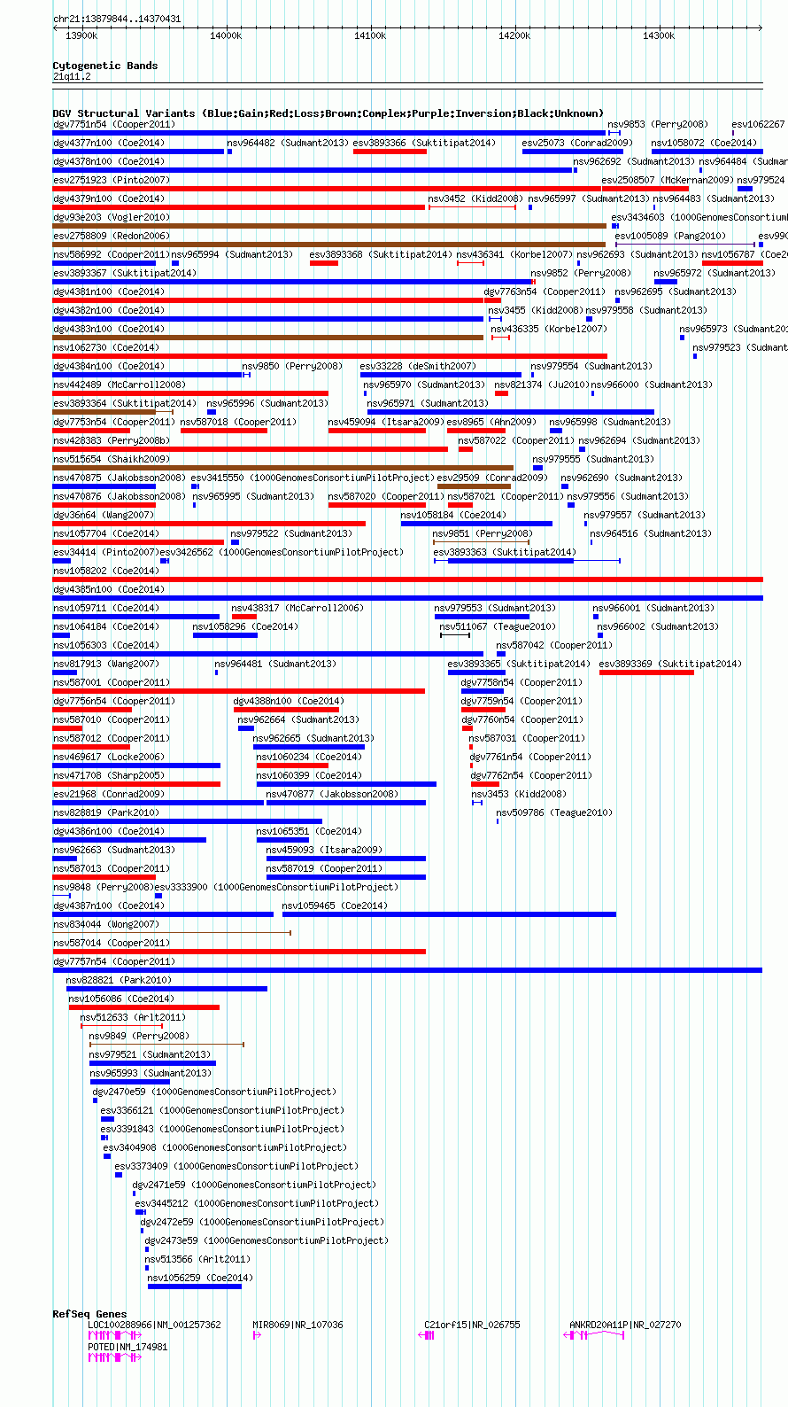 Variant DetailsVariant: dgv7757n54| Internal ID | 22775652 | | Landmark | | | Location Information | | | Cytoband | 21q11.2 | | Allele length | | Assembly | Allele length | | hg38 | 490588 | | hg19 | 490588 | | hg18 | 490588 |