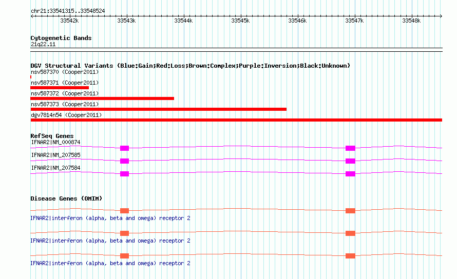 | | Variant Type | CNV loss | | Copy Number | | | Allele State | | | Allele Origin | | | Probe Count | | | Validation Flag | | | Merged Status | M | | Merged Variants | | | Supporting Variants | nsv587374, nsv587375 | | Samples | | | Known Genes | IFNAR2 | | Method | SNP array | | Analysis | Illumina SNP array copy number analysis | | Platform | Not reported | | Comments | | | Reference | Cooper_et_al_2011 | | Pubmed ID | 21841781 | | Accession Number(s) | dgv7814n54