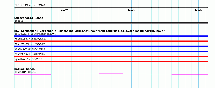 Variant DetailsVariant: dgv787n67 | Internal ID | 22781770 | | Landmark | | | Location Information | | | Cytoband | 3p26.2 | | Allele length | | Assembly | Allele length | | hg38 | 2893 | | hg19 | 2893 | | hg18 | 2893 |