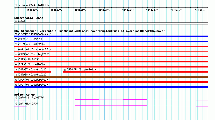 Variant DetailsVariant: dgv7926n54| Internal ID | 22775821 | | Landmark | | | Location Information | | | Cytoband | 21q22.3 | | Allele length | | Assembly | Allele length | | hg38 | 809 | | hg19 | 809 | | hg18 | 809 |