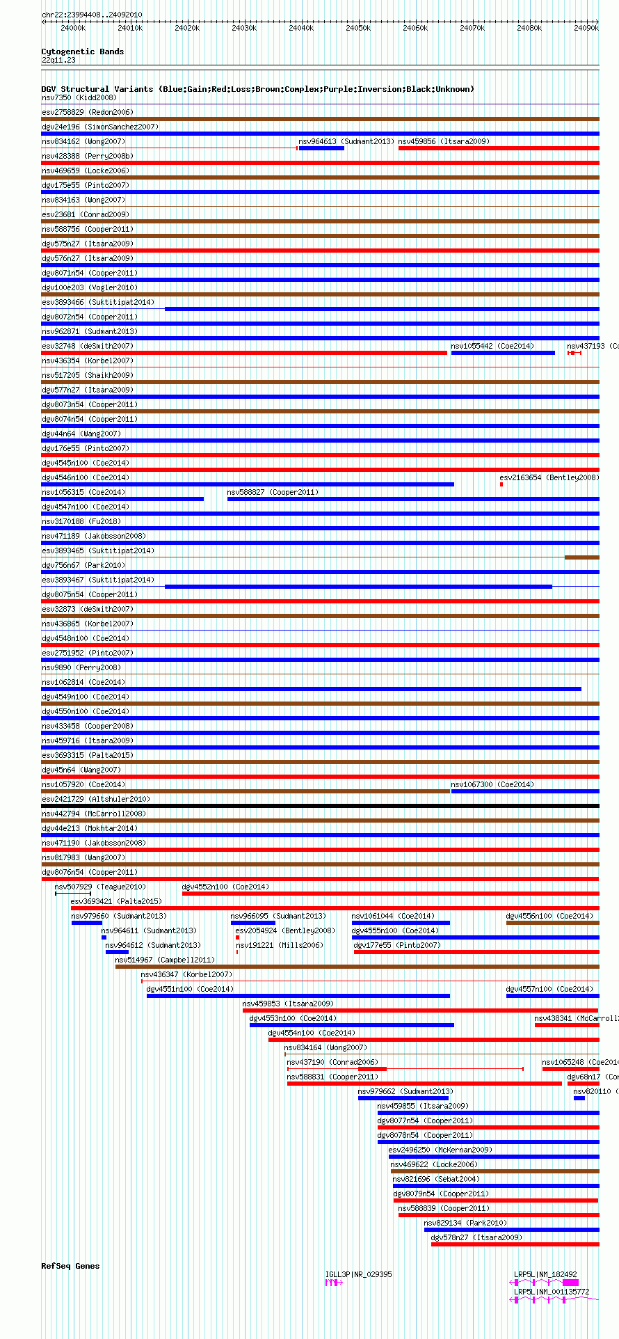 Variant DetailsVariant: dgv8076n54| Internal ID | 22775971 | | Landmark | | | Location Information | | | Cytoband | 22q11.23 | | Allele length | | Assembly | Allele length | | hg38 | 97603 | | hg19 | 97603 | | hg18 | 97603 |