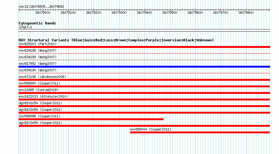 Variant DetailsVariant: dgv8103n54| Internal ID | 22775998 | | Landmark | | | Location Information | | | Cytoband | 22q13.1 | | Allele length | | Assembly | Allele length | | hg38 | 988 | | hg19 | 988 | | hg18 | 988 |