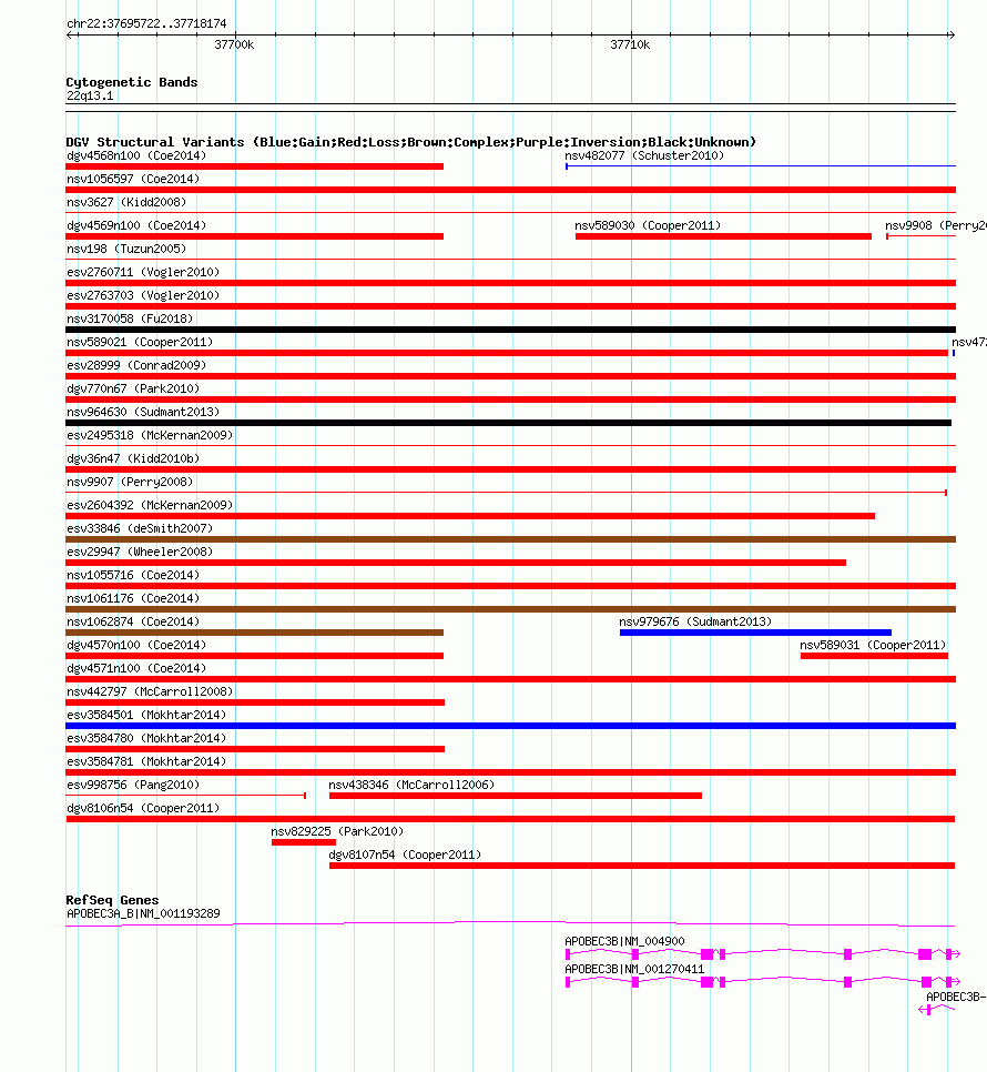 | | Variant Type | CNV loss | | Copy Number | | | Allele State | | | Allele Origin | | | Probe Count | | | Validation Flag | | | Merged Status | M | | Merged Variants | | | Supporting Variants | nsv589024, nsv589022, nsv589026, nsv589027, nsv589023, nsv589025 | | Samples | | | Known Genes | APOBEC3A_B, APOBEC3B, APOBEC3B-AS1 | | Method | SNP array | | Analysis | Illumina SNP array copy number analysis | | Platform | Not reported | | Comments | | | Reference | Cooper_et_al_2011 | | Pubmed ID | 21841781 | | Accession Number(s) | dgv8106n54
