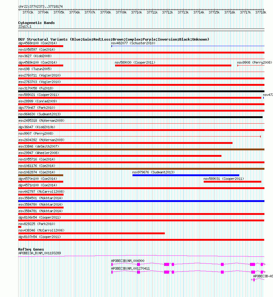 | | Variant Type | CNV loss | | Copy Number | | | Allele State | | | Allele Origin | | | Probe Count | | | Validation Flag | | | Merged Status | M | | Merged Variants | | | Supporting Variants | nsv589028, nsv589029 | | Samples | | | Known Genes | APOBEC3A_B, APOBEC3B, APOBEC3B-AS1 | | Method | SNP array | | Analysis | Illumina SNP array copy number analysis | | Platform | Not reported | | Comments | | | Reference | Cooper_et_al_2011 | | Pubmed ID | 21841781 | | Accession Number(s) | dgv8107n54