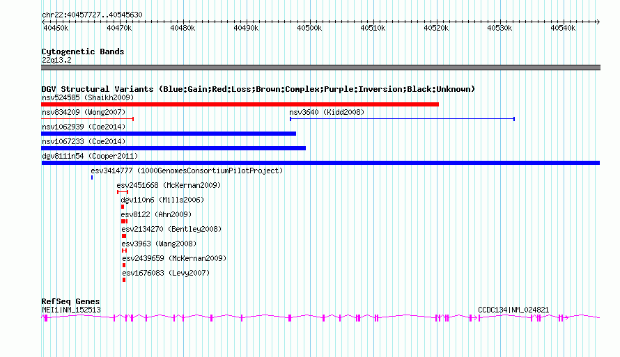 Variant DetailsVariant: dgv8111n54| Internal ID | 22776006 | | Landmark | | | Location Information | | | Cytoband | 22q13.2 | | Allele length | | Assembly | Allele length | | hg38 | 87904 | | hg19 | 87904 | | hg18 | 87904 |