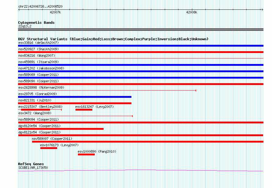 | | Variant Type | CNV loss | | Copy Number | | | Allele State | | | Allele Origin | | | Probe Count | | | Validation Flag | | | Merged Status | M | | Merged Variants | | | Supporting Variants | nsv589096, nsv589093 | | Samples | | | Known Genes | SCUBE1 | | Method | SNP array | | Analysis | Illumina SNP array copy number analysis | | Platform | Not reported | | Comments | | | Reference | Cooper_et_al_2011 | | Pubmed ID | 21841781 | | Accession Number(s) | dgv8121n54