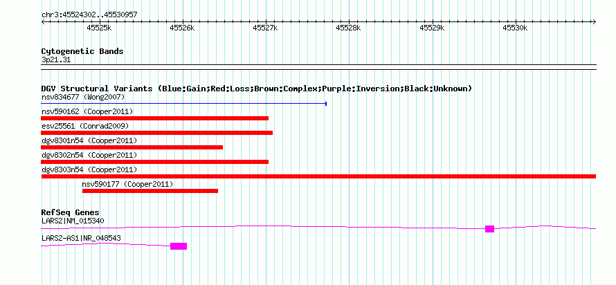 | | Variant Type | CNV loss | | Copy Number | | | Allele State | | | Allele Origin | | | Probe Count | | | Validation Flag | | | Merged Status | M | | Merged Variants | | | Supporting Variants | nsv590170, nsv590169, nsv590174 | | Samples | | | Known Genes | LARS2, LARS2-AS1 | | Method | SNP array | | Analysis | Illumina SNP array copy number analysis | | Platform | Not reported | | Comments | | | Reference | Cooper_et_al_2011 | | Pubmed ID | 21841781 | | Accession Number(s) | dgv8303n54