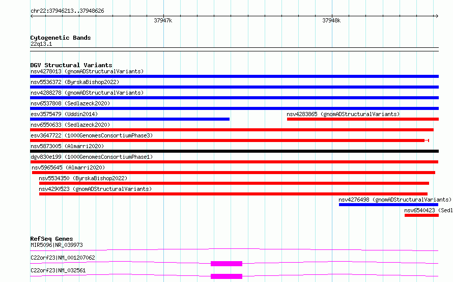 Variant DetailsVariant: dgv830e199| Internal ID | 22758603 | | Landmark | | | Location Information | | | Cytoband | 22q13.1 | | Allele length | | Assembly | Allele length | | hg38 | 2414 | | hg19 | 2414 |