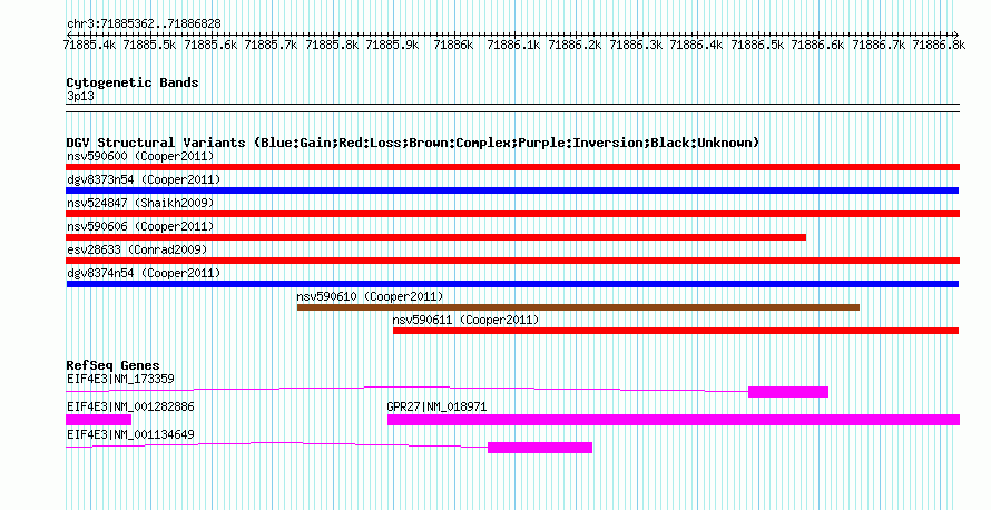 |  | Variant Type | CNV gain |  | Copy Number |  |  | Allele State |  |  | Allele Origin |  |  | Probe Count |  |  | Validation Flag |  |  | Merged Status | M |  | Merged Variants |  |  | Supporting Variants | nsv590607, nsv590609, nsv590608 |  | Samples |  |  | Known Genes | EIF4E3, GPR27 |  | Method | SNP array |  | Analysis | Illumina SNP array copy number analysis |  | Platform | Not reported |  | Comments |  |  | Reference | Cooper_et_al_2011 |  | Pubmed ID | 21841781 |  | Accession Number(s) | dgv8374n54