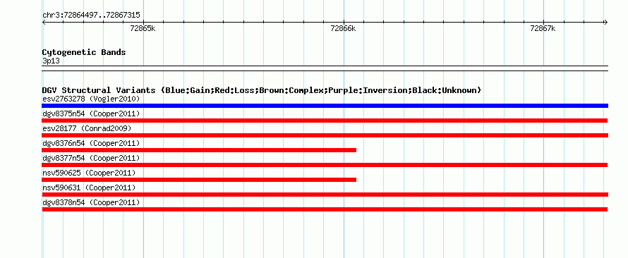 Variant DetailsVariant: dgv8378n54| Internal ID | 22776273 | | Landmark | | | Location Information | | | Cytoband | 3p13 | | Allele length | | Assembly | Allele length | | hg38 | 2819 | | hg19 | 2819 | | hg18 | 2819 |