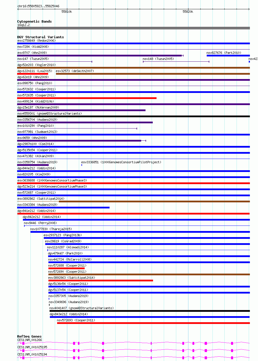Variant DetailsVariant: dgv841e212| Internal ID | 20149297 | | Landmark | | | Location Information | | | Cytoband | 16q12.2 | | Allele length | | Assembly | Allele length | | hg38 | 19124 | | hg19 | 19124 |