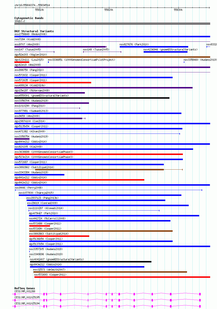 Variant DetailsVariant: dgv842e212| Internal ID | 20149298 | | Landmark | | | Location Information | | | Cytoband | 16q12.2 | | Allele length | | Assembly | Allele length | | hg38 | 28141 | | hg19 | 28141 |