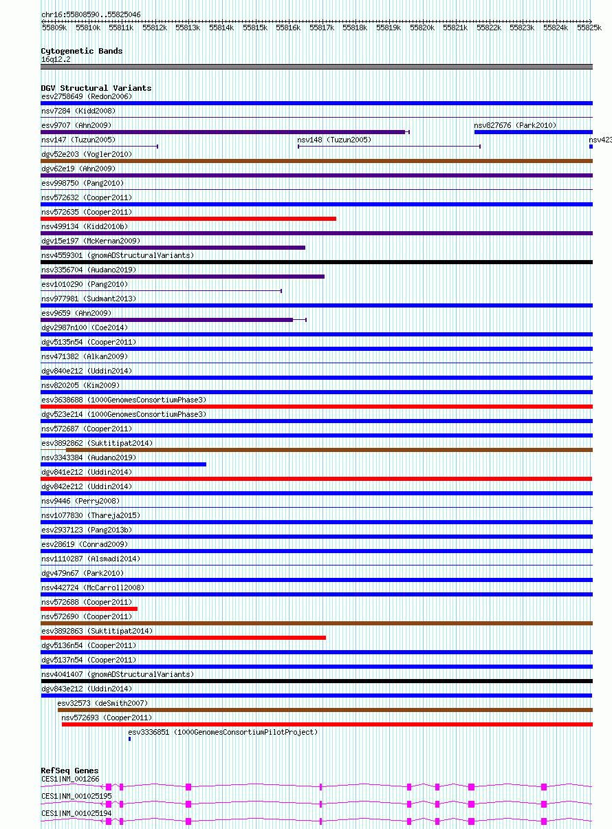 | | Variant Type | CNV gain | | Copy Number | | | Allele State | | | Allele Origin | | | Probe Count | | | Validation Flag | | | Merged Status | M | | Merged Variants | | | Supporting Variants | esv3571376, esv3571197 | | Samples | 401162TM, 401235IA, 400674CA, 400515ZG, 401736BF, 400543CK, 401606CG, 400211BJ, 400524NJ, 400520FM, 400837HN, 401661HD, 401152MV, 402023EC | | Known Genes | CES1 | | Method | SNP array | | Analysis | We used four separate algorithms to detect CNVs; Affymetrix Chromosome Analysis Suite (ChAS), iPattern, Nexus and Partek. Our primary analysis was performed based on ChAS CNV calls, which were then supported using the remaining three algorithms to construct a confidence set of CNVs. For all algorithms, we have used 8 probes and >1kb as a base line cutoff for CNV detection. | | Platform | Affymetrix CytoScan HD 2.7M array | | Comments | | | Reference | Uddin_et_al_2014 | | Pubmed ID | 25503493 | | Accession Number(s) | dgv843e212
