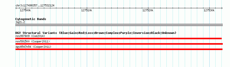 Variant DetailsVariant: dgv8547n54| Internal ID | 22776442 | | Landmark | | | Location Information | | | Cytoband | 3q21.2 | | Allele length | | Assembly | Allele length | | hg38 | 33768 | | hg19 | 33768 | | hg18 | 33768 |