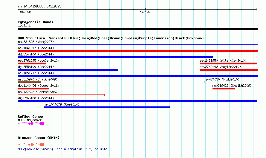 | | Variant Type | CNV gain | | Copy Number | | | Allele State | | | Allele Origin | | | Probe Count | | | Validation Flag | | | Merged Status | M | | Merged Variants | | | Supporting Variants | nsv1038975, nsv1044280 | | Samples | | | Known Genes | MBL2 | | Method | SNP array | | Analysis | Affymetrix SNP array copy number analysis | | Platform | Affymetrix SNP Array 6.0 | | Comments | | | Reference | Coe_et_al_2014 | | Pubmed ID | 25217958 | | Accession Number(s) | dgv856n100