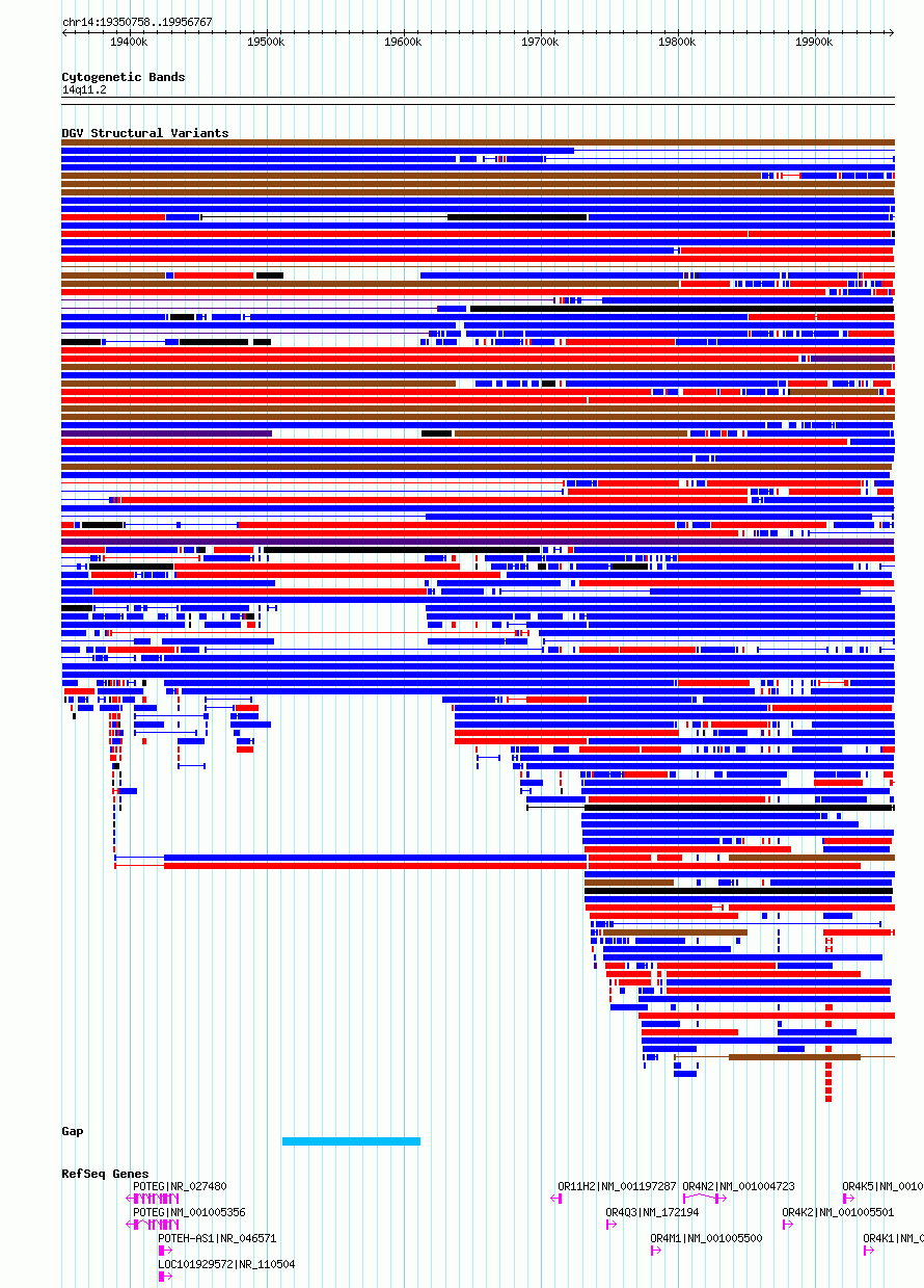 Variant DetailsVariant: dgv86n111| Internal ID | 22798286 | | Landmark | | | Location Information | | | Cytoband | 14q11.2 | | Allele length | | Assembly | Allele length | | hg38 | 606010 | | hg19 | 486486 |