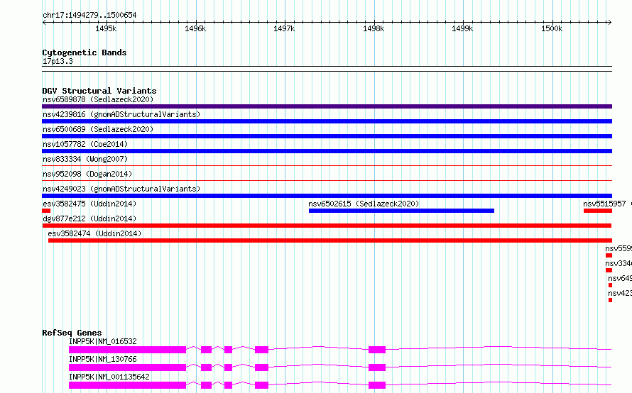 Variant DetailsVariant: dgv877e212| Internal ID | 22783804 | | Landmark | | | Location Information | | | Cytoband | 17p13.3 | | Allele length | | Assembly | Allele length | | hg38 | 6376 | | hg19 | 6376 |