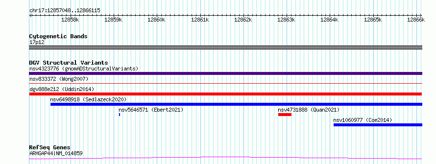 Variant DetailsVariant: dgv888e212| Internal ID | 22783815 | | Landmark | | | Location Information | | | Cytoband | 17p12 | | Allele length | | Assembly | Allele length | | hg38 | 9068 | | hg19 | 9068 |