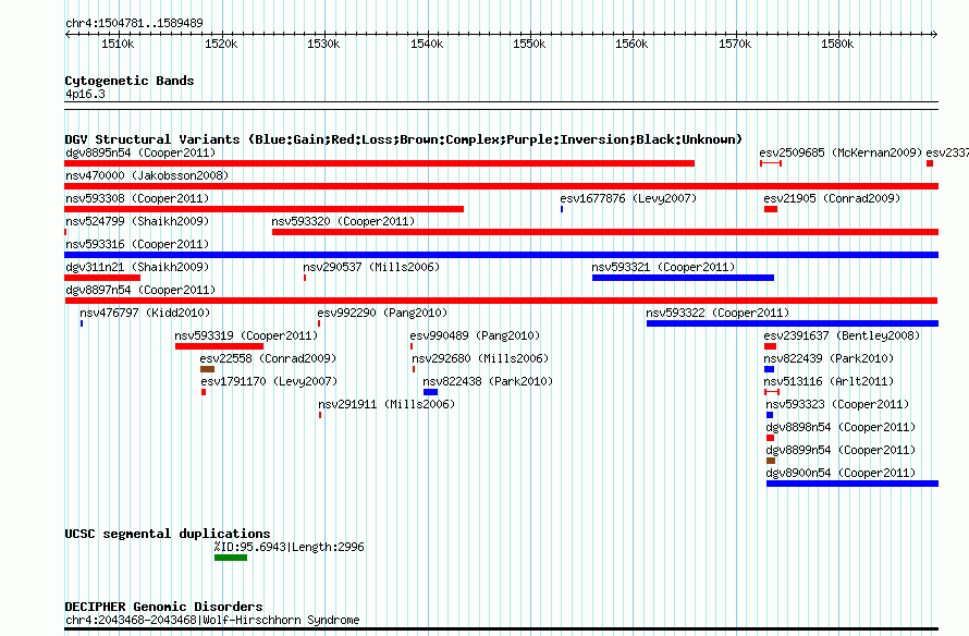 Variant DetailsVariant: dgv8897n54| Internal ID | 20142321 | | Landmark | | | Location Information | | | Cytoband | 4p16.3 | | Allele length | | Assembly | Allele length | | hg38 | 85555 | | hg19 | 85555 | | hg18 | 84709 |