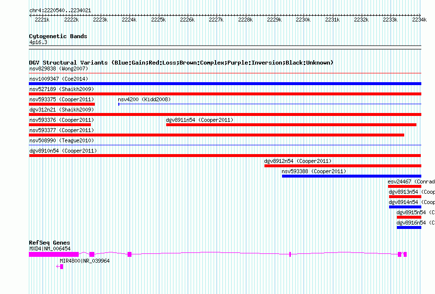 | | Variant Type | CNV loss | | Copy Number | | | Allele State | | | Allele Origin | | | Probe Count | | | Validation Flag | | | Merged Status | M | | Merged Variants | | | Supporting Variants | nsv593379, nsv593378, nsv593382, nsv593381, nsv593380 | | Samples | | | Known Genes | MIR4800, MXD4 | | Method | SNP array | | Analysis | Illumina SNP array copy number analysis | | Platform | Not reported | | Comments | | | Reference | Cooper_et_al_2011 | | Pubmed ID | 21841781 | | Accession Number(s) | dgv8910n54