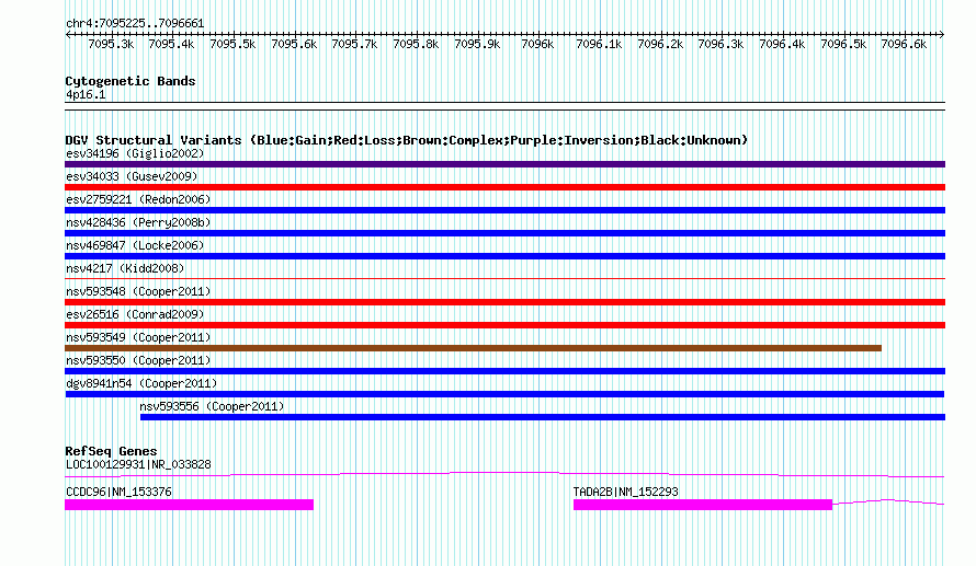 | | Variant Type | CNV gain | | Copy Number | | | Allele State | | | Allele Origin | | | Probe Count | | | Validation Flag | | | Merged Status | M | | Merged Variants | | | Supporting Variants | nsv593557, nsv593552, nsv593554, nsv593553, nsv593555, nsv593551 | | Samples | | | Known Genes | CCDC96, LOC100129931, TADA2B | | Method | SNP array | | Analysis | Illumina SNP array copy number analysis | | Platform | Not reported | | Comments | | | Reference | Cooper_et_al_2011 | | Pubmed ID | 21841781 | | Accession Number(s) | dgv8941n54