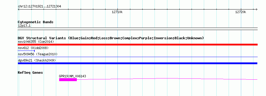 | Variant Type | CNV gain | Copy Number | | Allele State | | Allele Origin | | Probe Count | | Validation Flag | | Merged Status | M | Merged Variants | | Supporting Variants | nsv522656, nsv528913 | Samples | | Known Genes | GPR19 | Method | SNP array | Analysis | Sample-level CNVs | Platform | GPL6434 | Comments | | Reference | Shaikh_et_al_2009 | Pubmed ID | 19592680 | Accession Number(s) | dgv89n21