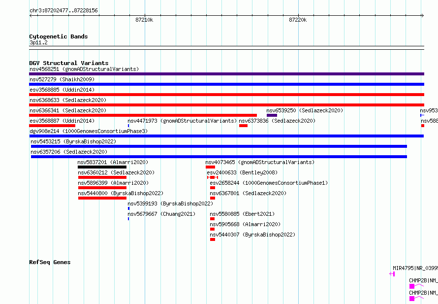 | | Variant Type | CNV gain | | Copy Number | | | Allele State | | | Allele Origin | | | Probe Count | | | Validation Flag | | | Merged Status | M | | Merged Variants | | | Supporting Variants | esv3596883, esv3596882 | | Samples | HG00641, NA12249 | | Known Genes | CHMP2B, MIR4795 | | Method | Sequencing | | Analysis | | | Platform | Multiple platforms | | Comments | | | Reference | 1000_Genomes_Consortium_Phase_3 | | Pubmed ID | 21293372 | | Accession Number(s) | dgv908e214