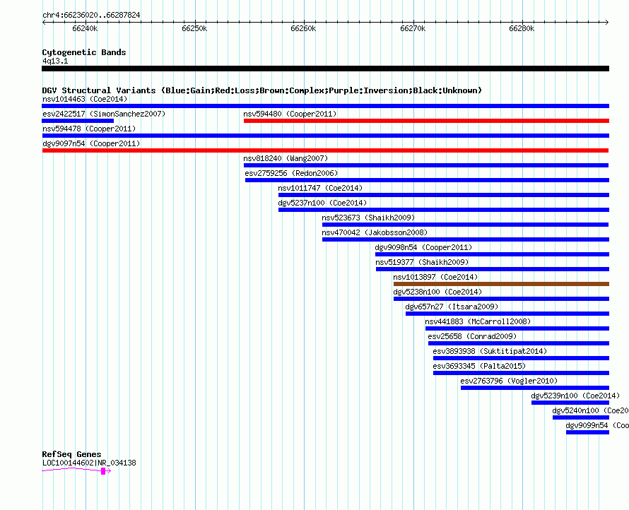 Variant DetailsVariant: dgv9097n54| Internal ID | 22776992 | | Landmark | | | Location Information | | | Cytoband | 4q13.1 | | Allele length | | Assembly | Allele length | | hg38 | 51805 | | hg19 | 51805 | | hg18 | 51805 |