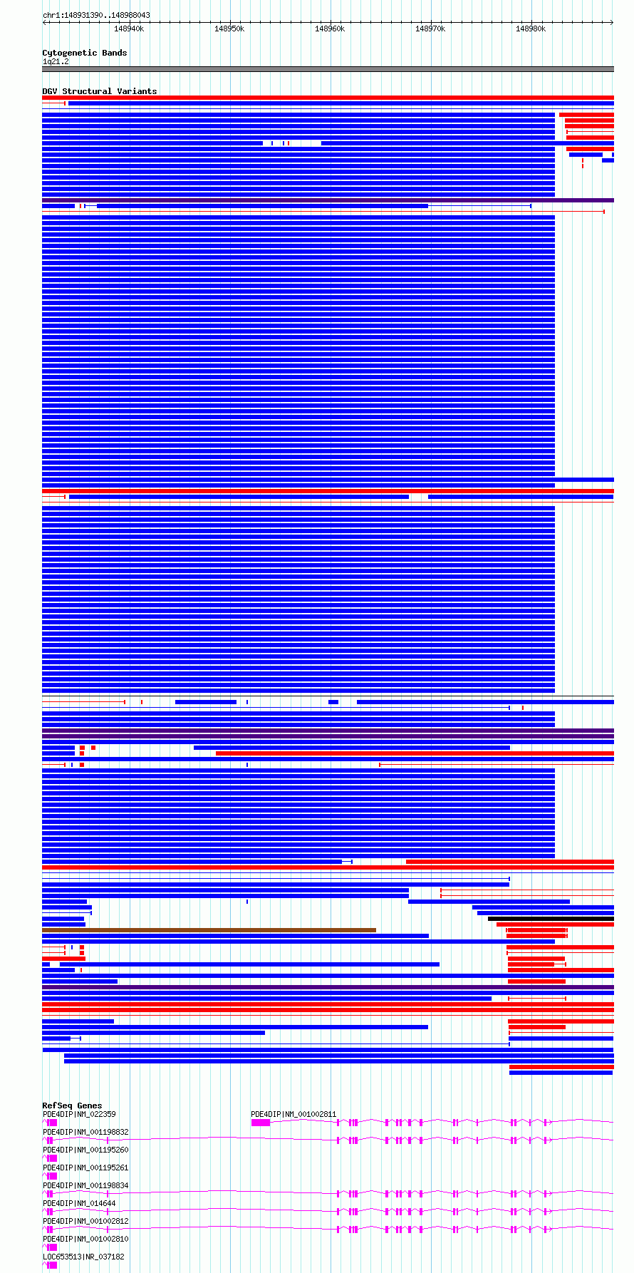Variant DetailsVariant: dgv90e212| Internal ID | 22783017 | | Landmark | | | Location Information | | | Cytoband | 1q21.1 | | Allele length | | Assembly | Allele length | | hg38 | 56654 | | hg19 | 56669 |