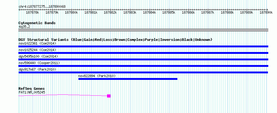 Variant DetailsVariant: dgv917n67 | Internal ID | 22781900 | | Landmark | | | Location Information | | | Cytoband | 4q35.2 | | Allele length | | Assembly | Allele length | | hg38 | 12794 | | hg19 | 12794 | | hg18 | 12794 |