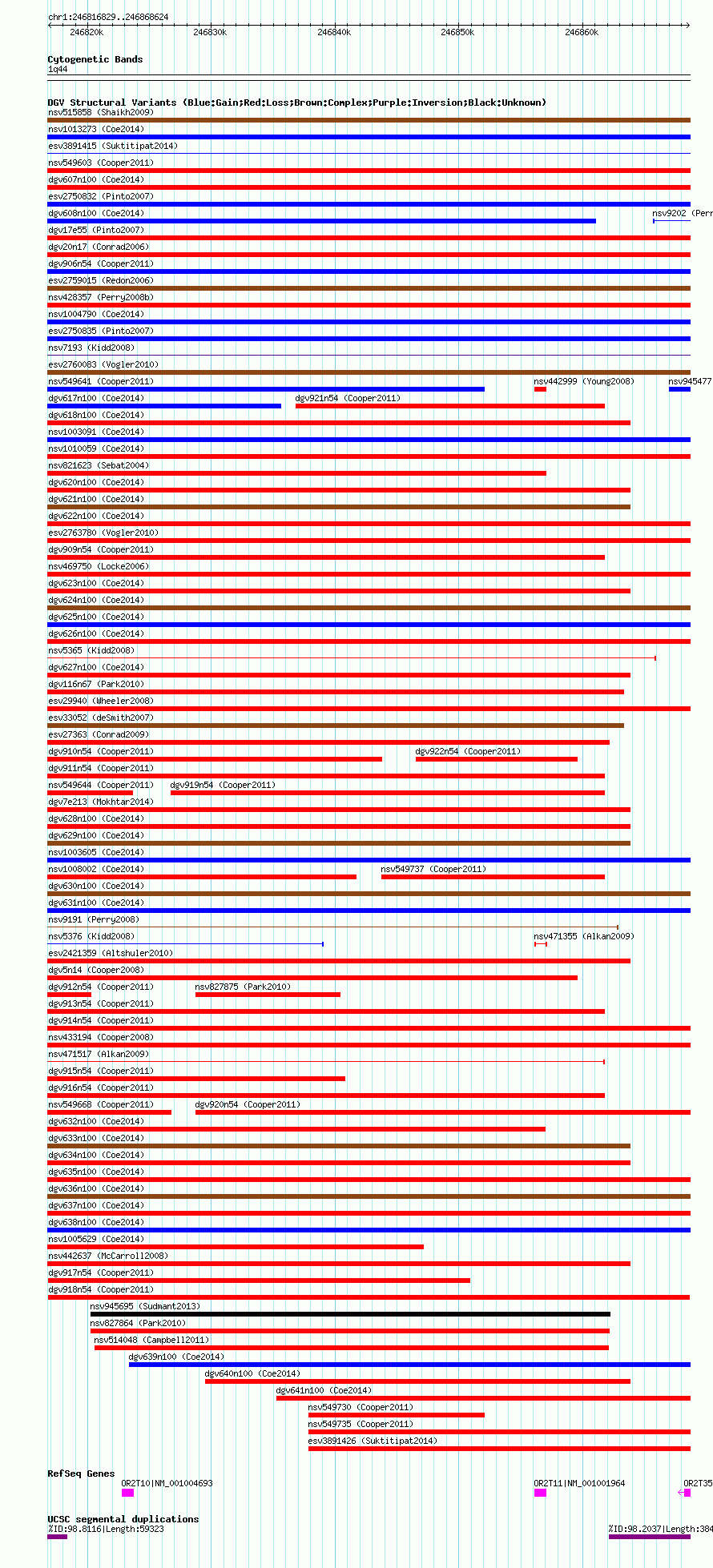| | Variant Type | CNV loss | | Copy Number | | | Allele State | | | Allele Origin | | | Probe Count | | | Validation Flag | | | Merged Status | M | | Merged Variants | | | Supporting Variants | nsv549709, nsv549688, nsv549690, nsv549717, nsv549701, nsv549714, nsv549691, nsv549689, nsv549693, nsv549700, nsv549692, nsv549687, nsv549710, nsv549713, nsv549686, nsv549702, nsv549703, nsv549708, nsv549716 | | Samples | | | Known Genes | OR2T10, OR2T11, OR2T35 | | Method | SNP array | | Analysis | Illumina SNP array copy number analysis | | Platform | Not reported | | Comments | | | Reference | Cooper_et_al_2011 | | Pubmed ID | 21841781 | | Accession Number(s) | dgv918n54