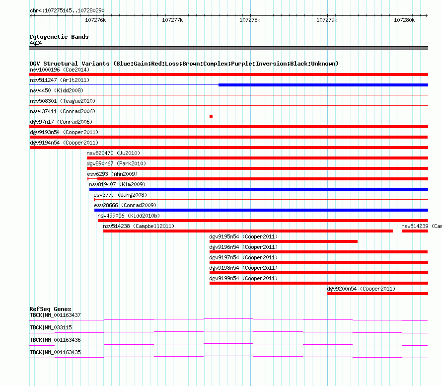 | | Variant Type | CNV loss | | Copy Number | | | Allele State | | | Allele Origin | | | Probe Count | | | Validation Flag | | | Merged Status | M | | Merged Variants | | | Supporting Variants | nsv595010, nsv595009 | | Samples | | | Known Genes | TBCK | | Method | SNP array | | Analysis | Illumina SNP array copy number analysis | | Platform | Not reported | | Comments | | | Reference | Cooper_et_al_2011 | | Pubmed ID | 21841781 | | Accession Number(s) | dgv9193n54