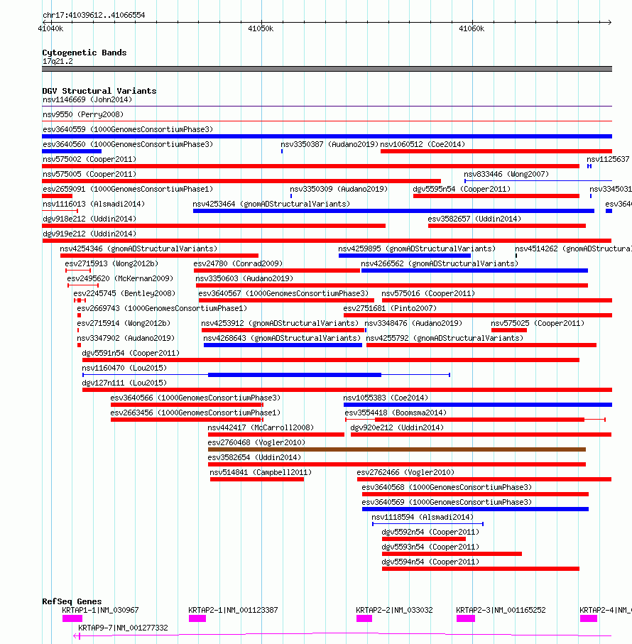Variant DetailsVariant: dgv919e212 | Internal ID | 20149375 | | Landmark | | | Location Information | | | Cytoband | 17q21.2 | | Allele length | | Assembly | Allele length | | hg38 | 26943 | | hg19 | 26943 |