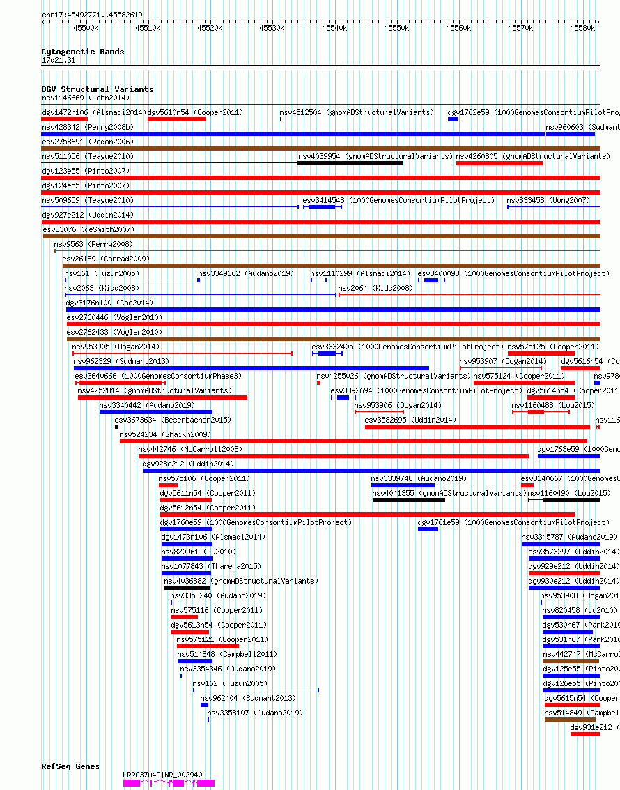 Variant DetailsVariant: dgv927e212 Internal ID | 20149383 | Landmark | | Location Information | | Cytoband | 17q21.31 | Allele length | Assembly | Allele length | hg38 | 89849 | hg19 | 89849 |
