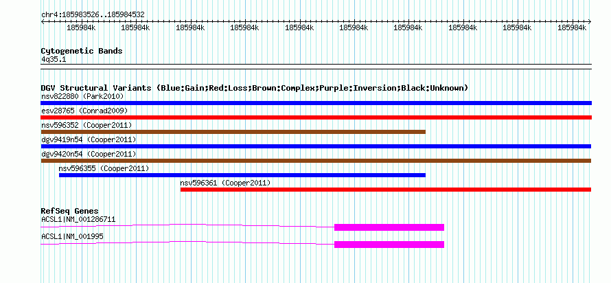 | | Variant Type | CNV gain | | Copy Number | | | Allele State | | | Allele Origin | | | Probe Count | | | Validation Flag | | | Merged Status | M | | Merged Variants | | | Supporting Variants | nsv596357, nsv596353, nsv596359, nsv596360, nsv596356 | | Samples | | | Known Genes | ACSL1 | | Method | SNP array | | Analysis | Illumina SNP array copy number analysis | | Platform | Not reported | | Comments | | | Reference | Cooper_et_al_2011 | | Pubmed ID | 21841781 | | Accession Number(s) | dgv9419n54