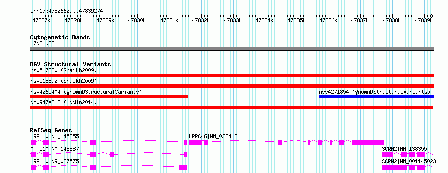 Variant DetailsVariant: dgv947e212 | Internal ID | 20149403 | | Landmark | | | Location Information | | | Cytoband | 17q21.32 | | Allele length | | Assembly | Allele length | | hg38 | 12646 | | hg19 | 12646 |