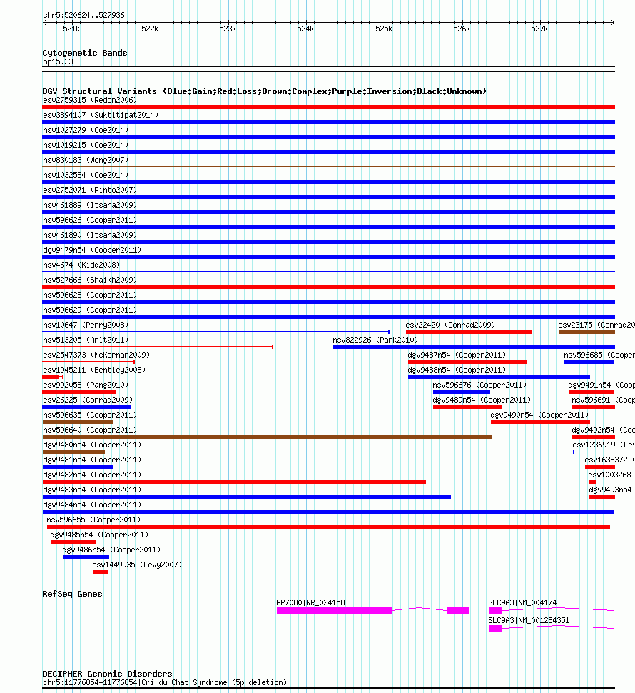 Variant DetailsVariant: dgv9484n54| Internal ID | 22777379 | | Landmark | | | Location Information | | | Cytoband | 5p15.33 | | Allele length | | Assembly | Allele length | | hg38 | 7313 | | hg19 | 7313 | | hg18 | 7313 |