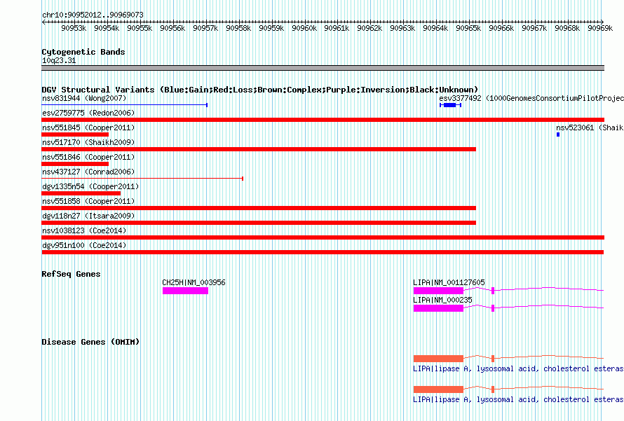 | Variant Type | CNV loss | Copy Number | | Allele State | | Allele Origin | | Probe Count | | Validation Flag | | Merged Status | M | Merged Variants | | Supporting Variants | nsv1042428, nsv1040280 | Samples | | Known Genes | CH25H, LIPA | Method | SNP array | Analysis | Affymetrix SNP array copy number analysis | Platform | Affymetrix SNP Array 6.0 | Comments | | Reference | Coe_et_al_2014 | Pubmed ID | 25217958 | Accession Number(s) | dgv951n100