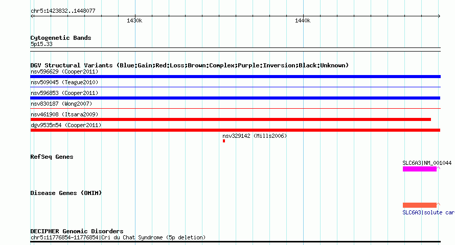 | | Variant Type | CNV loss | | Copy Number | | | Allele State | | | Allele Origin | | | Probe Count | | | Validation Flag | | | Merged Status | M | | Merged Variants | | | Supporting Variants | nsv596855, nsv596856 | | Samples | HGDP00971, HGDP00830 | | Known Genes | SLC6A3 | | Method | SNP array | | Analysis | Illumina SNP array copy number analysis | | Platform | Not reported | | Comments | | | Reference | Cooper_et_al_2011 | | Pubmed ID | 21841781 | | Accession Number(s) | dgv9535n54