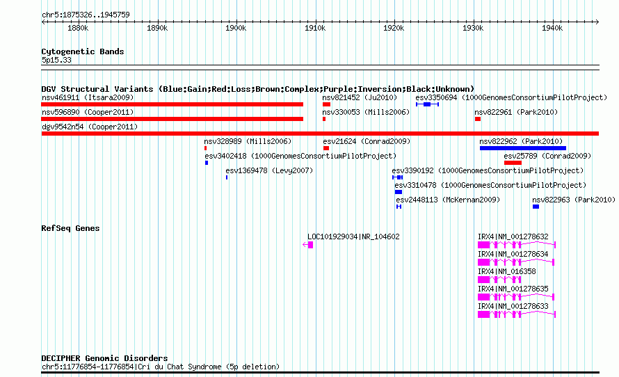 | | Variant Type | CNV loss | | Copy Number | | | Allele State | | | Allele Origin | | | Probe Count | | | Validation Flag | | | Merged Status | M | | Merged Variants | | | Supporting Variants | nsv596891, nsv596893, nsv596892 | | Samples | | | Known Genes | IRX4, LOC101929034 | | Method | SNP array | | Analysis | Illumina SNP array copy number analysis | | Platform | Not reported | | Comments | | | Reference | Cooper_et_al_2011 | | Pubmed ID | 21841781 | | Accession Number(s) | dgv9542n54